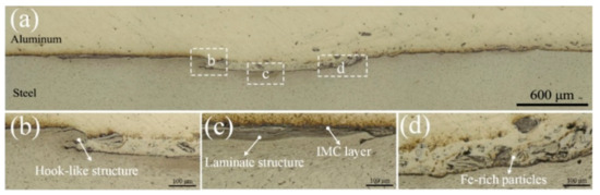 Interfacial macro-microstructures of Al/Fe lap joint with rotation speed of 1000 rpm and welding speed of 200 mm/min. (a) interfacial macrostructure; (b) hook-like feature; (c) laminate structure; and (d) particles composite-like structure.
