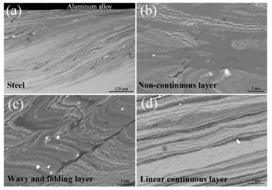 Not enough time can be provided for the diffusion of Al and Fe atoms to form Al/Fe IMCs layer due to the short diffusion time. However, Figure 11 indicates the IMC formation at Al/steel interface. The Al content in the mixed layered structure measured with EDX ranged from 10 to 55 wt %, which indicated the presence of Fe3Al, FeAl and FeAl2 according to the Al-Fe binary phase diagram. It can be concluded that the fracture occurred mainly along the layer structure. The EDS chemical composition maps in Figure 12 show the overlap of aluminum atoms and iron atoms in the IMC layers. This concentration profile again showed the interdiffusion of Al and Fe atoms across the interface of mixed layered structure.