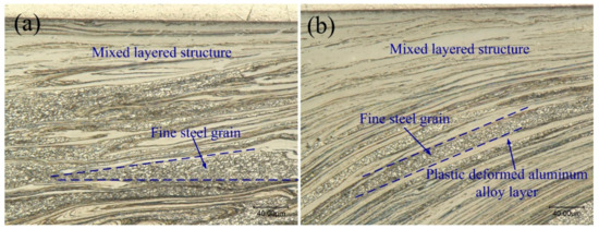 Mixed layered structure showing fine steel grain. (a) Middle part of interfacial zone; (b) advancing side of interfacial zone.