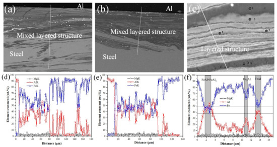 Scanning electron microscopy (SEM) line scanning results. (a) macrostructure of the interface at the center of the joint; (b) macrostructure of the interface on retreating side of the joint; (c) the layered structure at the interface; and (d–f) the line scan results.