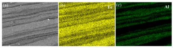 Chemical maps of the layered structure. (a) The composite map showing initial structure; (b) element Fe; and (c) element Al.