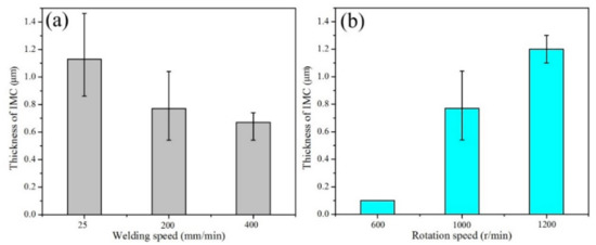 The variation of IMC thickness at the interface with different welding parameters. (a) Variation of the welding speed; and (b) variation of the rotation speed.