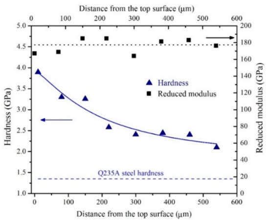 Nano-hardness and elastic modulus across the steel surface layer were also measured by using a nanoindenter with a Berkovich tip, as shown in Figure 15. The joint was achieved with rotational speed of 600 r/min and welding speed of 200 mm/min. Nano-hardness decreases from about 3.9 GPa in the upper surface layer to about 1.3 GPa in the base material. Severe plastic deformation takes place in the steel surface layer close to the interface, resulting in ultrafine structure attributed to the recrystallization of the steel after undergoing heavy plastic deformation by the rotating pin. There is plenty of evidence to indicate that a gradient microstructure composed of ultrafine structure was developed in a very thin layer on the upper steel surface layer. The elastic moduli values (about 178 GPa) of the base material and the upper steel surface layer are unchanged, independent of grain size in the present grain size regime.