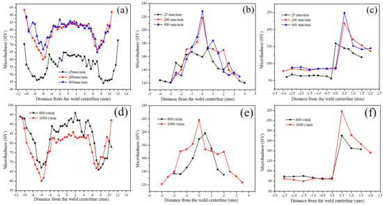 The microhardness distribution of Al/steel lap joints with different rotation speeds and welding speeds. (a–e) are transverse microhardness distribution; (c,f) are microhardness distribution through the thickness. (a) Al side joint with different welding speeds; (b) Q235A steel at 0.5 mm below the weld interface with different welding speeds; (c) microhardness distribution in thickness direction with different welding speeds; (d) Al side joint with different rotation speeds; (e) Q235A steel at 0.5 mm below the weld interface with different rotation speeds; and (f) microhardness distribution in thickness direction with different rotation speeds.
