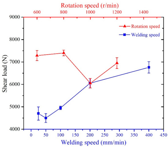 The average shear loads of the testing samples with various welding speeds and rotation speeds are presented in Figure 17. Although the measured values of failure loads were scattered, they showed a tendency to increase slightly with increasing welding speed from 25 to 400 mm/min. As indicated in Figure 4a,b, chaotic mixed structures with a mass of defects such as cracking and voids, were produced on the advancing side when welding speed is lower than 100 mm/min, which counteracts the contribution of the mechanical interlocking effect and is responsible for the deterioration of joint strength. However, Liyanage et al. [28] indicated that plastic deformation of the steel surface (Figure 6) during the FSLW process will promote mechanical interlocking, which will contribute to joint strength. Haghshenas et al. [29] pointed out that the high heat input will promote the formation of IMCs when aluminum alloys and steels are joined together, which may contain pre-existing cracks, have high hardness, and thus limit joint strength. Since at higher welding speed, heat input and thermal cycle decrease which reduces the IMCs thickness and interfacial complexity. With an increase in rotation speed, the ultimate shear load value gradually increased and then decreased. Increasing rotation speed from 600 to 800 rpm improved joint strength, although a further increase from 800 to 1000 rpm caused a decrease in fracture load. Maximum shear load of 7500 N was achieved with rotation speed of 800 rpm and welding speed of 200 mm/min. The combined effects of stirring action, frictional heat and pressure restrained the formation of IMC layers in the interfacial zone between aluminum alloy and steel, providing a strong joint with high quality.