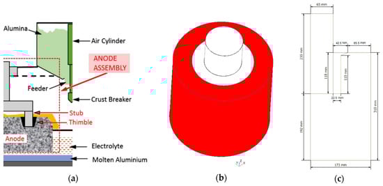 (a) Hall-Héroult electrolytic cell [3] (Reproduced with permission from Gunasegaram and Molenaar [3], Elsevier Ltd., 2013); (b) stub-to-carbon (STC) assembly: stub (light gray), thimble (dark gray) and carbon anode (red), Longitudinal axis (blue arrow) and radial axis (red arrow); (c) Half slice geometry used for the simulations, dimensions in mm, longitudinal-radial plane.