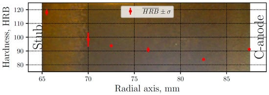 Measured mean hardness () and standard deviation (σ) along radial axis. Macrograph of a polished sample of the thimble (background).