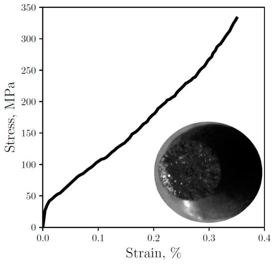 Some researchers have characterized and modeled the GCI elastoplastic behavior [30,51,52,53]. In this work, the stress-strain curve is experimentally measured and presented in Figure 4 along with an image of the fractured sample, which reveals the presence of white iron and its brittle fracture. The measured ultimate tensile strength is σf = 334.9 MPa, similar to the one reported in [30] for GCIs samples with higher cooling rates. Furthermore, the Young’s modulus calculated from Figure 4 is E = 82.6 GPa. Owing to the sample have a mixture of eutectics, a higher graphite content affects diminishing E [27] while at the same time white iron increases this value [54]. Nevertheless, Figure 4 shows the low percentage of white iron in the sample which consequently does not affect so much the material elastic response. On the other hand, this low percentage is able to affect the toughness through the presence of carbides that reduce ductility, thereby preventing the curve from having a distinctive yield point followed by plastic deformation, causing the brittle fracture during the elastic behavior.