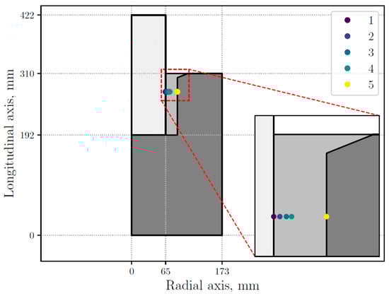 The numerical results show that the most significant microstructural changes occur along the radial, rather than longitudinal, axis. Therefore, as in the experimental measurements, the evolution of different variables of the model is presented along the radial axis of the thimble. Thus, the numerical results are presented at the points marked in Figure 6, selected in such way that they may capture microstructural transitions, specifically the GTW transition at both the inner and outer edges of the sample. The selected points are located at 65.05, 67.60, 70.39, 72.62, and 87.45 mm in the radial axis.