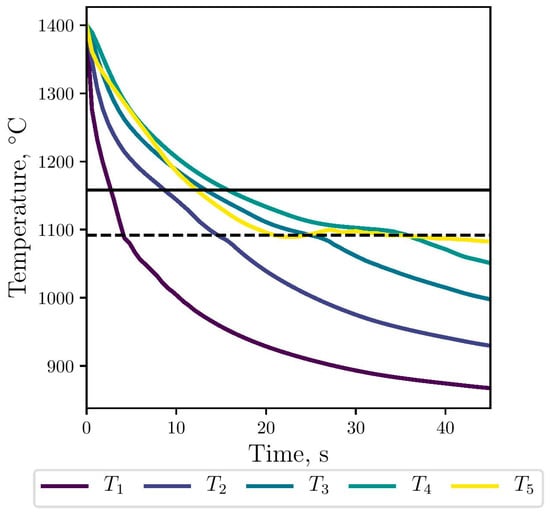 The gray eutectic crystallization, i.e., the stable transformation, begins at Tg, marked with the horizontal line in Figure 7. Then, below Tc, marked with the horizontal dashed line, the metastable transformation starts with the nucleation and growth of the white eutectic. At this temperature, both eutectics can growth in a competitive way. As expected, the simulated cooling rates along the thimble decrease as it moves away from the stub (selected points from 1 to 4). Near the carbon anode, the cooling curve in yellow is similar to that obtained in points 3 and 4 until Tc; below this temperature, the solidification process is slower. At the top of the thimble, the maximum calculated cooling rate is −43 °C/s, which is consistent with the value −40 °C/s reported in [2].