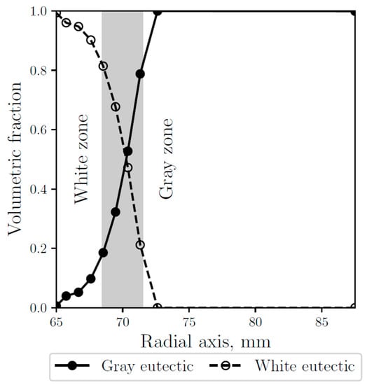 As shown in Figure 8, where the gray and white fraction along the radial axis are compared with the observed white and gray zones, the numerical results are validated, obtaining a good agreement, consistent with the microstructures observed at the micrographs (see Figure 5). The anode carbon has a relatively high thermal conductivity coefficient, however, the outside part of the thimble that is in contact with it did not form white eutectic in the simulations, which is consistent with the observations.