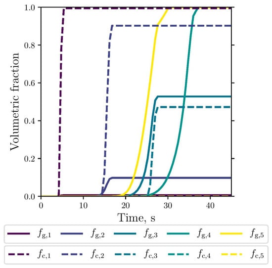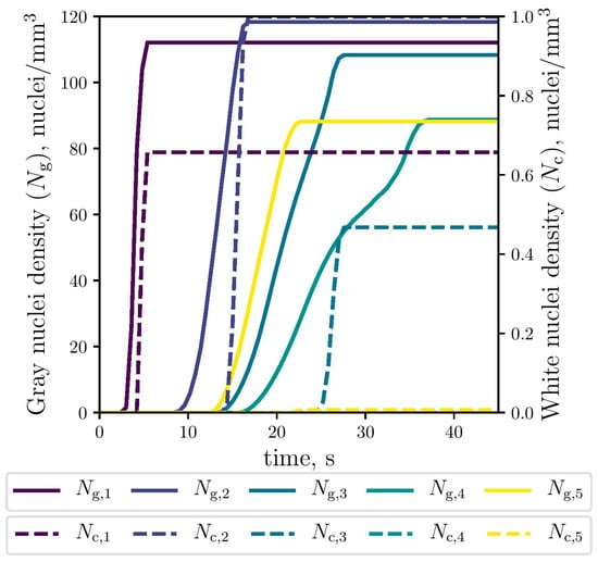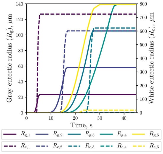 The simulated evolution of the microstructural variables is shown in Figure 9, Figure 10 and Figure 11. The competitive growth between the gray and white eutectics can be seen in Figure 9. Figure 10 shows that the growth of the white eutectic is much faster than the gray eutectic because the diffusion of atoms needed to form carbides (i.e., cementite) is much lower than that for graphite [56]. However, the white eutectic nucleation is rather sluggish [5] requiring lower temperatures to begin. Therefore, as shown in Figure 11, lesser quantities of white eutectic grains, but greater than the gray ones, are obtained. So, it is seen that growth rate plays an important role on the final volumetric fraction, since once the metastable solidification begins, the white fraction increases rapidly, as can be seen in Figure 9.