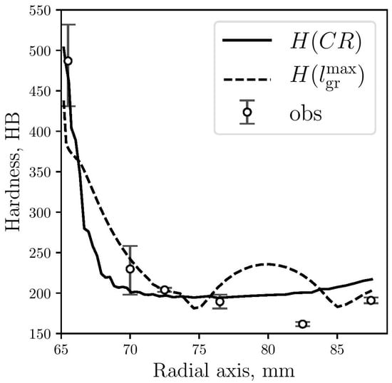 In Figure 12, predicted hardness results are plotted against the corresponding measured data. While the numerical results obtained by Equation (4) show good agreement with the experimental observations, the results obtained by Equation (7) show a significant difference for a part of the gray zone, at 15 mm from the center. From the micrographs shown in Figure 6, it can be seen that graphite flakes are larger at that zone (Figure 5d), which is also captured by the model, obtaining higher values for Rg(see Figure 10) and . Due to this increase in graphite flakes, the microstructural hardness model (Equation (7)) also increases the hardness values at this zone although, however, this is not consistent with the measured values.