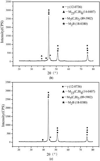 - The phases of cladding layers with different Co contents include γ, M7(C, B)3, M23(C, B)6, and M2B, where M is Cr and Fe. The amount of M7(C, B)3, M23(C, B)6, and M2B decreases gradually with the increase of the Co content.