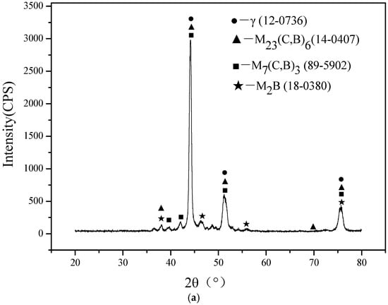- The phases of cladding layers with different Co contents include γ, M7(C, B)3, M23(C, B)6, and M2B, where M is Cr and Fe. The amount of M7(C, B)3, M23(C, B)6, and M2B decreases gradually with the increase of the Co content.