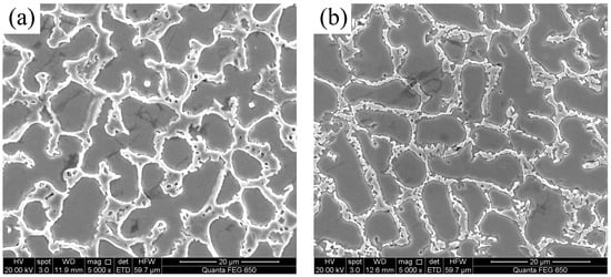 SEM analysis results of the middle of the cladding layers with different Co contents are presented in Figure 4. It is shown that the cladding layers are mainly composed of dark dendrite and bright eutectic structures. During the solidification process, the dendrites first precipitate from the liquid phase, and finally the eutectic structures are formed at grain boundaries. Chemical compositions of the eutectic structure (point 1) and dendrite (point 2) in Figure 4c were analyzed by EPMA point scanning, and the results are listed in Table 2. The contents of Cr and C in the eutectic structure (point 1) are notably higher than those in dendrites, which indicates that Cr and C elements are mainly precipitated at grain boundaries. Combined with the XRD results shown in Figure 2, the eutectic structures are mainly composed of M7(C, B)3, M23(C, B)6, and M2B. The dendrite (point 2) is mainly composed of Ni elements plus a certain amount of Cr and Co, which indicates that the dendrite mainly consists of γ matrix phase. With the increase of Co content, the width of the eutectic structures in the cladding layers decreases gradually. This is because Co can increase the solubility of Cr and C in the γ matrix, which decreases the width of the eutectic [37]. This is consistent with the XRD results where the amount of M7(C, B)3, M23(C, B)6, and M2B decreases with the increase of the Co content.