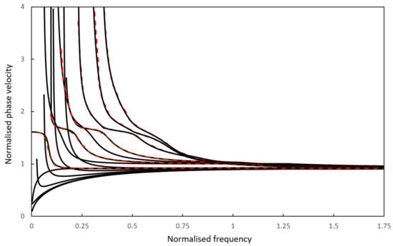 The eigen solution Equation (3) was programmed in MATLAB (R2017a, The MathWorks, Inc., Natick, MA, USA) and executed on a laptop with a 2.60 GHz Intel Core™ CPU and a 16 GB RAM. It has been shown that SAFE is able to deliver accurate solutions for dispersion curves in pipes [39]. The accuracy of the model for a rectangular plate is further examined here. The dispersion curves for a nickel plate are calculated and compared to the dispersion curves shown in ‘Figure 4a’ of Mukdadi et al.’s paper [13]. The thickness and width of the plate is 0.11 mm and 0.88 mm respectively. Material properties of the nickel plate can be represented as , , and [13]. Mukdadi et al. [13] used a variational principle to solve the governing equations. Analytical modal solutions were used in the wave propagation direction as well. A more general, weighted residual method is used in this paper. In principle, these two methods should deliver identical solutions, and this is shown in Figure 1 where the two numerical solutions match very well. Only a few low order modes are presented in Figure 1 for clarity, and this shows that SAFE is able to accurately calculate dispersion curves for rectangular plates. Note that SAFE is also able to calculate dispersion curves for Lamb waves in an infinitely wide plate. This can be done by setting displacements in the width direction to be constant. A number of additional convergence studies for plates have been carried out, and details are not shown here for the sake of space. Further validation of the SAFE model can be found in [39].