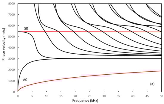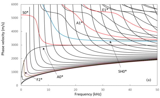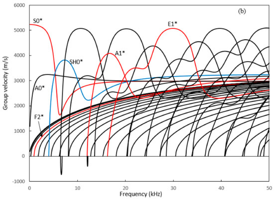 Figure 2 shows phase and group velocities for guided waves propagating in the rectangular plate. Dispersion curves for Lamb waves propagating in an infinite plate with a thickness of 10 mm and 400 mm are shown in Figure 3 for comparison. The dispersion curves are shown up to 50 kHz for clarity. Guided wave modes in the rectangular plate are different to Lamb wave modes in that these waves are reflected by four surfaces, rather than two. The number of wave modes is also much larger than corresponding Lamb-type wave modes. Backward waves can also be seen in Figure 2b with negative group velocities [45,46]. These waves are highly dispersive. For NDT applications, the incident mode is required to propagate as far as possible, and thus dispersive modes are normally avoided. Figure 2 shows that none of the modes has a constant velocity throughout the frequency range. However, it is possible to select a few modes that have a relatively uniform velocity distribution in a particular frequency band and these are marked in colour in Figure 2, and investigated further in this paper. The SH0* mode indicates a shear horizontal type mode with dominant displacement in the width direction of the plate. However, the displacement is not constant because the wave is reflected by surfaces. The superscript * is thus used to indicate that SH0* is different to the conventional shear-horizontal mode in an infinitely large plate where displacement is constant in the width direction. S0* and A0* modes are symmetric and anti-symmetric modes, respectively, along the width direction of the plate. As frequency increases, the wavelength of these modes decreases. They become Rayleigh waves in the high frequency range, where modal energy focuses near the edge of the plate. The detailed modal analysis of these and other modes is presented in the next section associated with their visualisation in the three-dimensional plate.