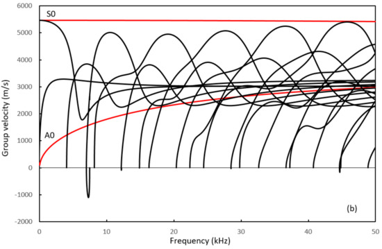 Dispersion curves for Lamb waves in an infinite plate: (a) phase velocity; (b) group velocity. Red line: 10 mm thickness; black line: 400 mm thickness.