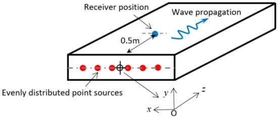 A commercial finite element software package, Abaqus (version 6.14-4, Dassault Systèmes Americas Corp., Waltham, MA, USA), has been used to visualise and validate this method. The plate has a thickness of 10 mm, width of 400 mm, and length of 1.5 m. The point sources are evenly distributed, and placed at the centre of the plate end (y = 0 and z = 0, see Figure 4). The edges between two surfaces have surface normals perpendicular to each other. This produces normal stress singularity lines and so no excitation point sources are placed on the edges of the plate. Suppose the number of point sources used for excitation of a particular mode is N, then the interval between adjacent point sources will be 400/(N + 1) mm, where 400 mm is the width of the plate. Thus the position of each source can be easily calculated based on the number of total point sources. The number of point sources, and the amplitude of each point source needed to excite a single mode are determined by the mode shape. The absolute amplitude of all the point sources could be increased or decreased proportionally; however, the relative amplitude of these point sources shall resemble the mode shape of the mode to be excited. For different wave modes, the direction of the loading displacement is also different. This depends on the direction of the dominant displacement seen from the mode shape. The details of these point sources will be presented in Section 4.1–Section 4.4. Rayleigh waves and three other types of waves are studied, i.e., shear type (dominant in x direction), flexural type (dominant in y direction) and extensional type (dominant in z direction).