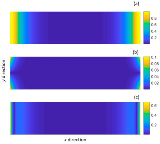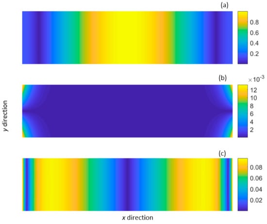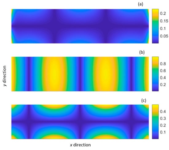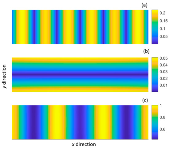 Normalised displacement distribution of the shear-horizontal type mode (SH0*): (a) shear displacement (x direction); (b) vertical displacement (y direction); (c) extensional displacement (z direction).