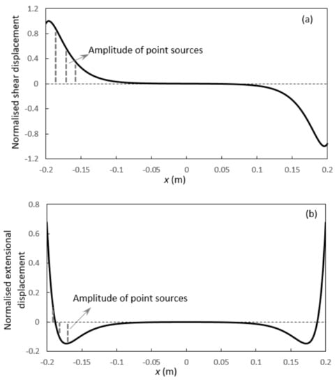 A number of discretised point sources along the centre line of the plate (shown in Figure 4) is proposed to excite this mode. The amplitude of point sources is determined by the mode shape shown in Figure 5. The shear and extensional displacements along the centre line of the plate are extracted from Figure 5a,c and represented in Figure 6a,b. Note that colour maps shown in Figure 5a,c are based on absolute displacement amplitude, while Figure 6a,b incorporate phase variations so that positive and negative displacements are presented. Further details on the amplitude of point sources and excitation of this wave mode will be presented in Figure 6.