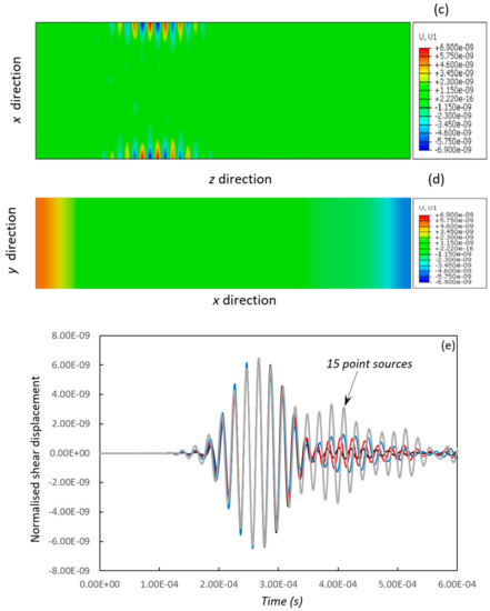 Figure 6c,d is generated wave distribution from 79 point sources, and it is clear that a single pure Rayleigh wave has been generated which propagates near the edges of the plate. Figure 6e compares the received time-domain wave forms from a varying number of point sources. As the number of sources decreases, the distance between adjacent point sources increases. The discretised loading displacement profile starts to deviate from the continuous displacement profile, and the noise level increases. When 15 point sources are used, the Rayleigh wave has been significantly influenced by other shearing waves from individual point sources.