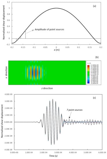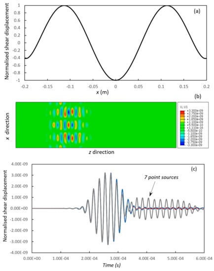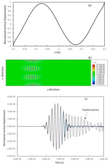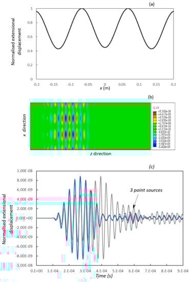 Figure 11a shows the extensional displacement distribution along the centre line of the plate, which is discretised and then used at the loading stage in the Abaqus model. Figure 11b,c show the displacement distribution generated in Abaqus. A single mode wave pattern can be seen clearly in Figure 11b with 19 evenly distributed point sources. The number of point sources can be further reduced, and the noise level is still low when only 7 sources are used. The noise level increases significantly when 3 point sources are used. Note that a number of other extensional modes have relatively flat dispersion curves but are not reported here for the sake of space.