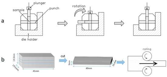 The diagrammatic drawing of (a) RD-ECAP (rotary-die equal-channel angular pressing) and (b) cold rolling.