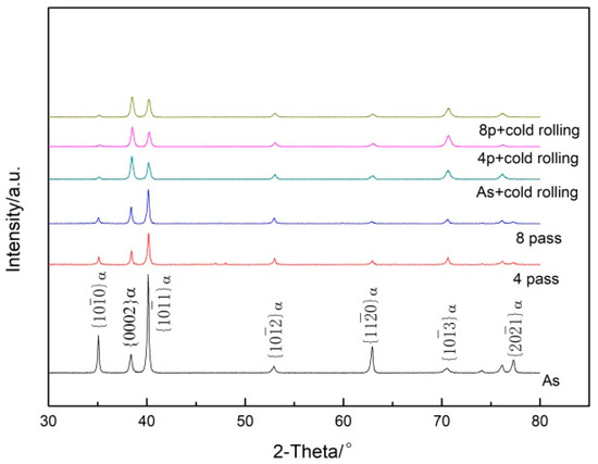 Figure 2 shows the XRD patterns of CP-Ti at all processing stages. For the as-received sample, all diffraction peaks correspond to α-Ti (hexagonal close-packed lattice structure). After multi-pass ECAP and CR processing, the locations of diffraction peaks remain unchanged, although the intensity of some peaks exhibits obvious change. Since there is no other phase detected by XRD for all samples, it can be confirmed that phase transformation was not activated during severe deformation in this work.