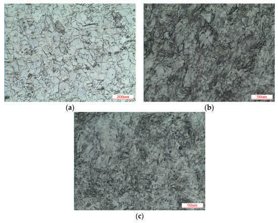 Optical micrographs of CP-Ti at different processing stages: (a) as-received; (b) after 4 passes ECAP; (c) after 8 passes ECAP.