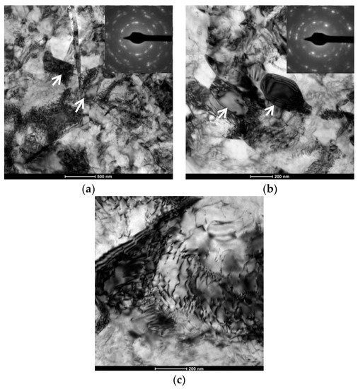 Figure 4a,b shows the TEM micrographs and corresponding SAED (selected area electron diffraction) patterns of ECAP samples after 4 passes and 8 passes, respectively. After 4 passes of RD-ECAP, it can be seen from Figure 4a that the grain size is refined to about 500 nm, and several grains are marked by white arrows in the figure. With increasing the number of ECAP passes to 8, the average grain size is decreased to 310 nm approximately, as is shown by arrows in Figure 4b. It should be noted that the decrease in grain size is significant compared with as-received CP-Ti. Moreover, it can be seen that the diffraction rings were intensive from corresponding SAED patterns, which also indicates that the grain size has been well refined. Moreover, Figure 4c shows that the density of dislocations is very high in 4p-ECAP CP-Ti, and distinct dislocation tangles can be easily observed. However, seen from Figure 4b, dislocation cells and sub-grain boundaries can be easily observed in 8p-ECAP CP-Ti, and the density of dislocations is decreased compared with 4p-ECAP sample.