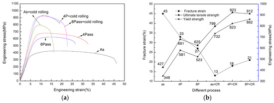 Figure 7a shows the room temperature tensile curves of CP-Ti at different processing stages. Moreover, the variations of ultimate tensile strength (UTS), tensile yield strength (TYS), and strain to failure with different processing stages are also summarized in Figure 7b. The as-received sample exhibits a low UTS of 427 MPa and a high strain to failure of 45.3%. After four passes of ECAP, there is a boost of strength, which increased to 681 MPa, but the fracture strain decreased to 33.1%. As for 8p-ECAP sample, its UTS and fracture strain have decreased by 9% and 16%, respectively, when compared with that of 4p-ECAP sample. When as-received and ECAP CP-Ti were cold rolled, their strengths are improved remarkably, but their fracture strains are reduced. The as-received + CR sample shows high UTS of 799 MPa, which is almost twice that of the as-received sample, and is even higher than both ECAP samples, suggesting that cold rolling exhibits a more obvious strengthening effect than ECAP. However, its ductility is greatly decreased compared with ECAP metals. When ECAP metals are cold rolled, a more obvious improvement of strength is observed. The 4p-ECAP + CR and 8p-ECAP + CR metals display high strength with UTS of 923 and 912 MPa, and moderate ductility with fracture strain of 18.2% and 21.3%, respectively. Therefore, it can be concluded that the strengthening effect of combined ECAP + CR method is more effective than single CR or ECAP pressing. In addition, an ultra-fine grained (nano-grained) CP-Ti with both high strength and good ductility is successfully fabricated via the combination of ECAP and cold rolling.