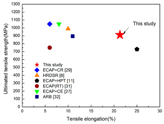 Different technologies have already been employed to process high strength CP-Ti [4]. Figure 9 shows the comparison of mechanical properties of CP-Ti (grade 2) in this work and that fabricated via other different technologies in reference [8,11,27,29,31,32]. Stolyarov et al. [27,29] combined ECAP with CR and cold extrusion (CE) and successfully fabricated two high strength CP-Ti with high UTS of 1050 MPa. However, their elongations decreased obviously, which were 6% and 8%, respectively. Moreover, Stolyarov et al. [11] also employed two SPD methods together on processing of CP-Ti, and by this ECAP + HPT (high pressure torsion) method, CP-Ti gained a better elongation of 25% but with a lower strength of 730 MPa. It can be seen that in these studies, high strength and high ductility were not attained simultaneously for CP-Ti. In addition, other SPD methods were also employed for processing of CP-Ti. Fattah-Alhosseini et al. [32] used accumulative roll bonded to process CP-Ti and a UTS of 989 MPa and elongation of 10% were obtained. Kim et al. [8] introduced high-radio differential speed rolling (HRDSR) on CP-Ti processing, and prepared CP-Ti with UTS of 895 MPa and elongation of 11%. Although the ductility was improved in these works, it still needs further improvement. In this work, when the RD-ECAP + CR combined method was carried out, although the ultimate tensile strength is a bit lower than some work, both high strength (above 900 MPa) and good ductility (above 20%) is attained for CP-Ti. This exhibits a better comprehensive mechanical property than previous works and the typical annealed Ti-6Al-4V (TC4) alloys (with UTS of 950 MPa and elongation of 14%) [33].