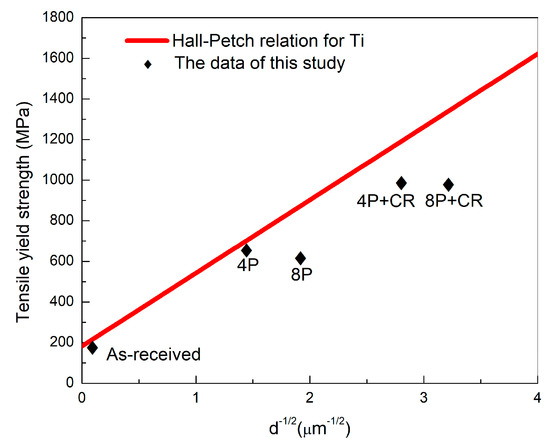 Grain size plays an important role in improving the strength of polycrystalline metallic materials [3,34]. Figure 10 shows the comparison of calculated Hall-Petch relationship for CP-Ti and the data obtained in this work. The Hall-Petch relationship is given by: