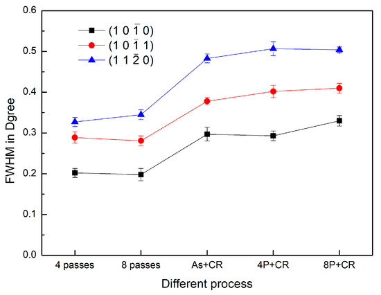 To quantitatively analyze the evolution of dislocation densities with different processing stages, we evaluated the dislocation density by XRD according to the Williamson-Hall method [37,38]. Figure 11 shows the full width at half maximum (FWHM) of three representative peaks from XRD patterns of CP-Ti with different processing stages. It can be seen that after cold rolling, the FWHM exhibits a remarkable increase compared with that of ECAP CP-Ti. Previous studies [28] demonstrated that the increase of peak width is associated with grain refinement and higher dislocation density. Based on the Williamson-Hall method [39,40], the following formula can be deduced:
