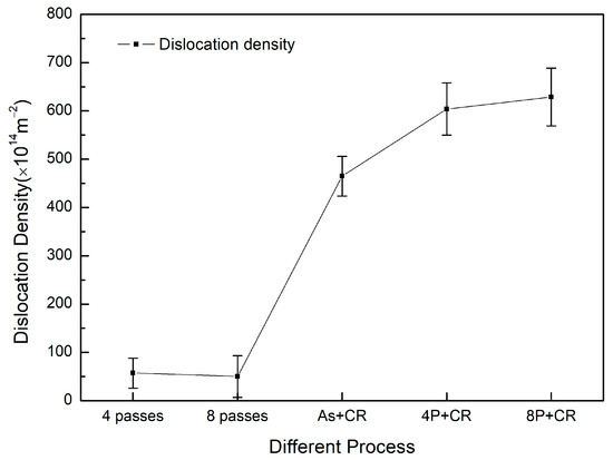 We have calculated the dislocation density from the above formula and the results are shown in Figure 12. It can be seen that the calculated dislocation density of 4p-ECAP alloy is a little higher than that of 8p-ECAP CP-Ti, which corresponds to TEM results. However, the dislocation density of ECAP CP-Ti is relatively low as the ECAP processing was conducted at a high temperature in this work. After cold rolling, the dislocation density increases remarkably regardless of the initial state before CR. Although 8p-ECAP + CR CP-Ti exhibits a little higher dislocation density than 4p-ECAP + CR CP-Ti, they are in the same magnitude order when considering the error limits. In addition, since the average grain size in 8p-ECAP + CR CP-Ti is smaller than 4p-ECAP + CR, and most dislocations are inclined to aggregate at grain boundaries, the dislocation density within α-Ti grains must be lower for 8p-ECAP + CR Ti than 4p-ECAP + CR Ti. The above obtained results are in good agreement with TEM observations in Figure 4 and Figure 6, which further demonstrates that high-density dislocations contribute to strengthening of this UFG CP-Ti.