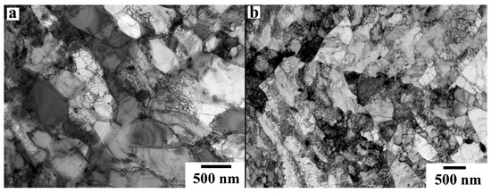 After tempering at 750 °C, TMLS forms in both steels. However, in the 9Cr2W steel, the additional formation of subgrains was observed (Figure 1a), whereas TMLS is dominant in the 9Cr3W steel (Figure 1b). The average sizes of PAGs were 11 and 20 µm for the 9Cr2W and 9Cr3W steels, respectively. More details about the microstructure of the steels studied after normalization at 1050 °C and tempering at 750 °C can be found elsewhere [27].