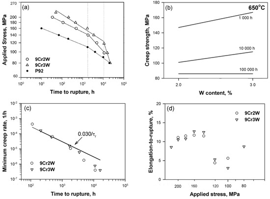(a) Time to rupture vs. stress curves for the 9Cr2W and 9Cr3W steels in comparison with data for a P92 steel [2,7]; (b) the 1000 h, 10,000 h, and 100,000 h creep rupture strengths of steels at 650 °C as a function of W content; (c) minimum creep rate as a function of time to rupture for the 9Cr2W and 9Cr3W steels; and (d) applied stress vs. elongation-to-rupture for the 9Cr2W and 9Cr3W steels. The dotted lines in (a) indicate the time to rupture corresponding to the creep strength breakdown.