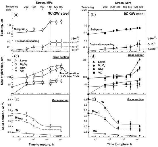 Solid solution. Solid solution of the 9Cr3W steel (Figure 6f) was more enriched by W than that of the 9Cr2W steel (Figure 6e) during short-term creep up to time t of ~500–700 h. After this exposure, there is no significant difference in W content in the solid solution of two steels.