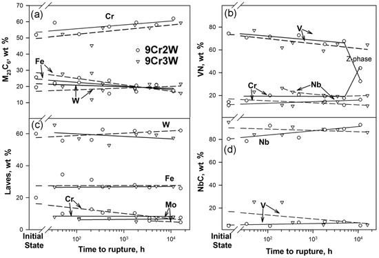 V-rich MX carbonitrides. The average size of V-rich MX particles attained 60 nm after long-term creep tests in both steels. In the 9Cr2W steel, the well-known replacement of V-rich MX carbonitrides by Z-phase (CrVN nitride), which is in fact the most thermodynamically stable nitride [31,32], started to occur after ~5000 h. The full transformation of all V-rich MX carbonitrides was found after 10,000 h of creep tests. The mean size of Z-phase was about 300 nm. Therefore, the size of V-rich carbonitrides increased by a factor of ~4.5 and they could not more contribute to the creep resistance of the 9Cr2W steel (Figure 6c). +1 wt %W additive shifted the onset of this transformation from 5000 h to 16,000 h; the separate Z-phase particles in the 9Cr3W steel were revealed after 16,000 h [33]. Nb content in the V-rich MX particles slightly increased with rupture time in both steel (Figure 7b). V content in the V-rich MX particles tended to decrease in the 9Cr3W steel with rupture time. At rupture time ≤5000 h, in the 9Cr2W steel, the V and Cr contents were essentially independent on the rupture time. Therefore, no gradual increase in Cr content within the V-rich MX particles resulting in transformation of their cubic lattice into tetragonal lattice of Z-phase [20,32,34] was detected.