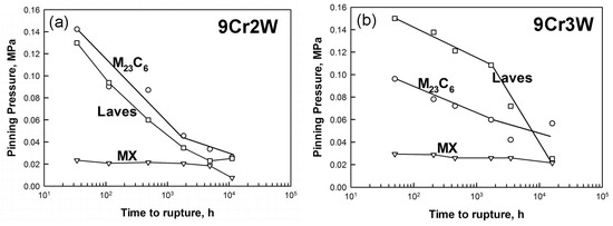 In the 9Cr2W steel, the М23С6 carbides gives the main contribution to overall Zener drag force at any applied stress [23], whereas in the 9Cr3W steel the highest Zener drag is exerted by Laves phase particles at the applied stresses more than 100 MPa [39]. Only at an applied stress of 100 MPa the Zener drag exerted by М23С6 carbides in this steel (9Cr3W) becomes higher than that exerted by Laves phase particles, and the PB and PZ values originated from Laves phase and MX carbonitrides, respectively, are the same at this condition (Figure 8b). In contrast, in the 9Cr2W steel, the PZ value drops at an applied stress of 100 MPa, owing to transformation of V-rich MX carbonitrides to Z-phase, and the pinning pressures from the boundary М23С6 carbides (PB) and MX carbonitrides with a random particle distribution (PZ) are similar at an applied stress of 120 MPa (Figure 8a).