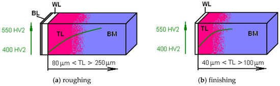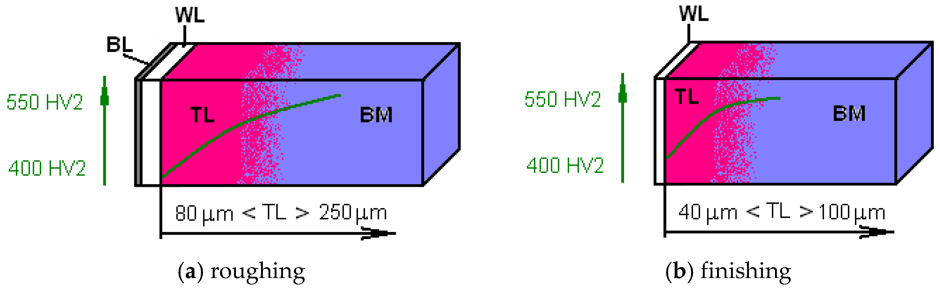 | Intensity of the volumetric material removal MRR (mm3·min−1) | roughing | 60.0–120.0 | With an increase of value of parameter MRR microhardness grows substantially. | With an increase of value of parameter MRR total HAZ depth grows markedly. |
