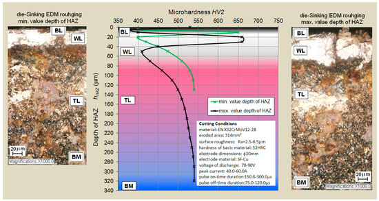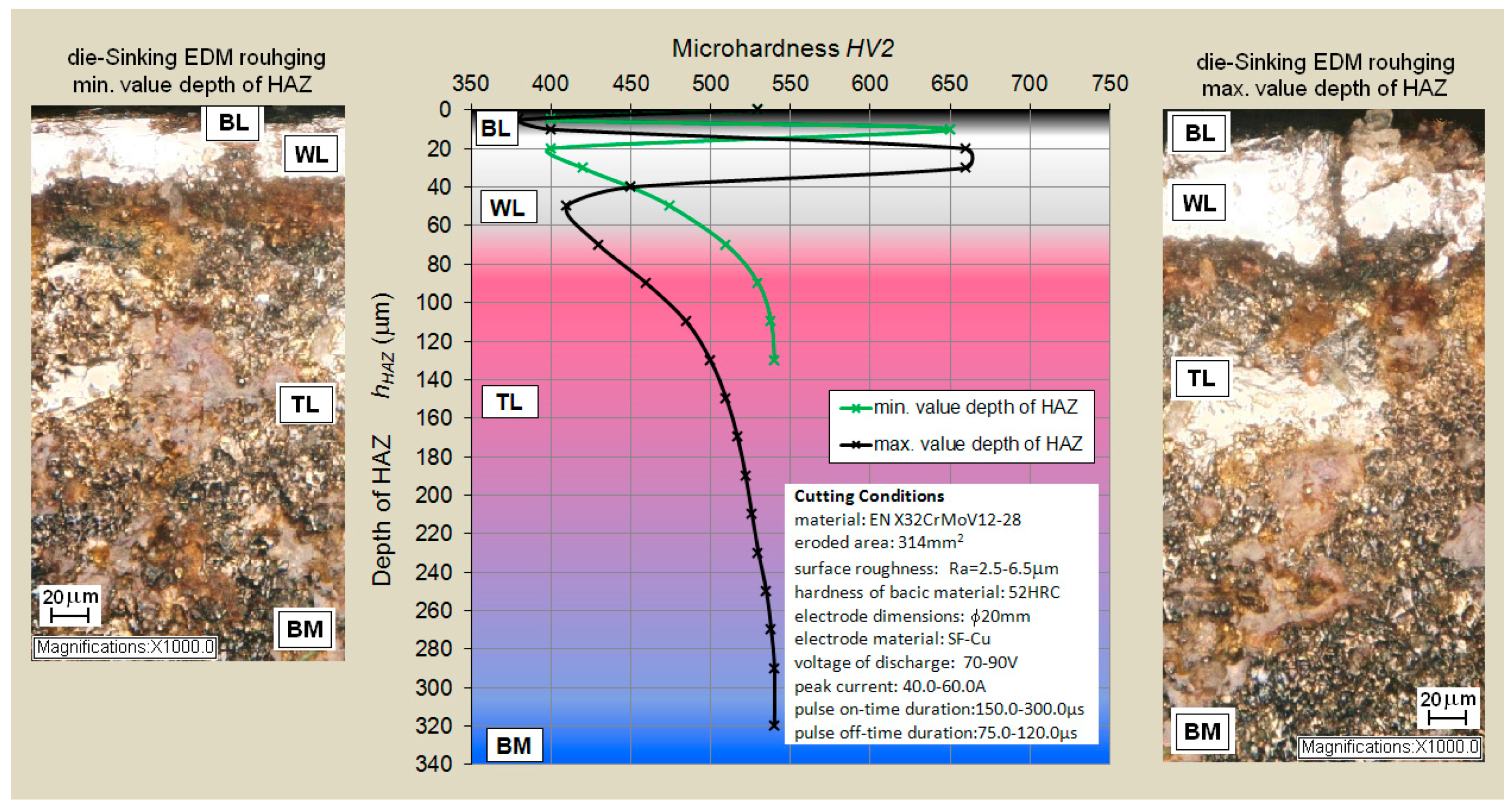 | Voltage of discharge U (V) | roughing | 70–90 | With a change of value of parameter U microhardness varies only slightly. | With a change of value of parameter U total HAZ depth varies only slightly. |