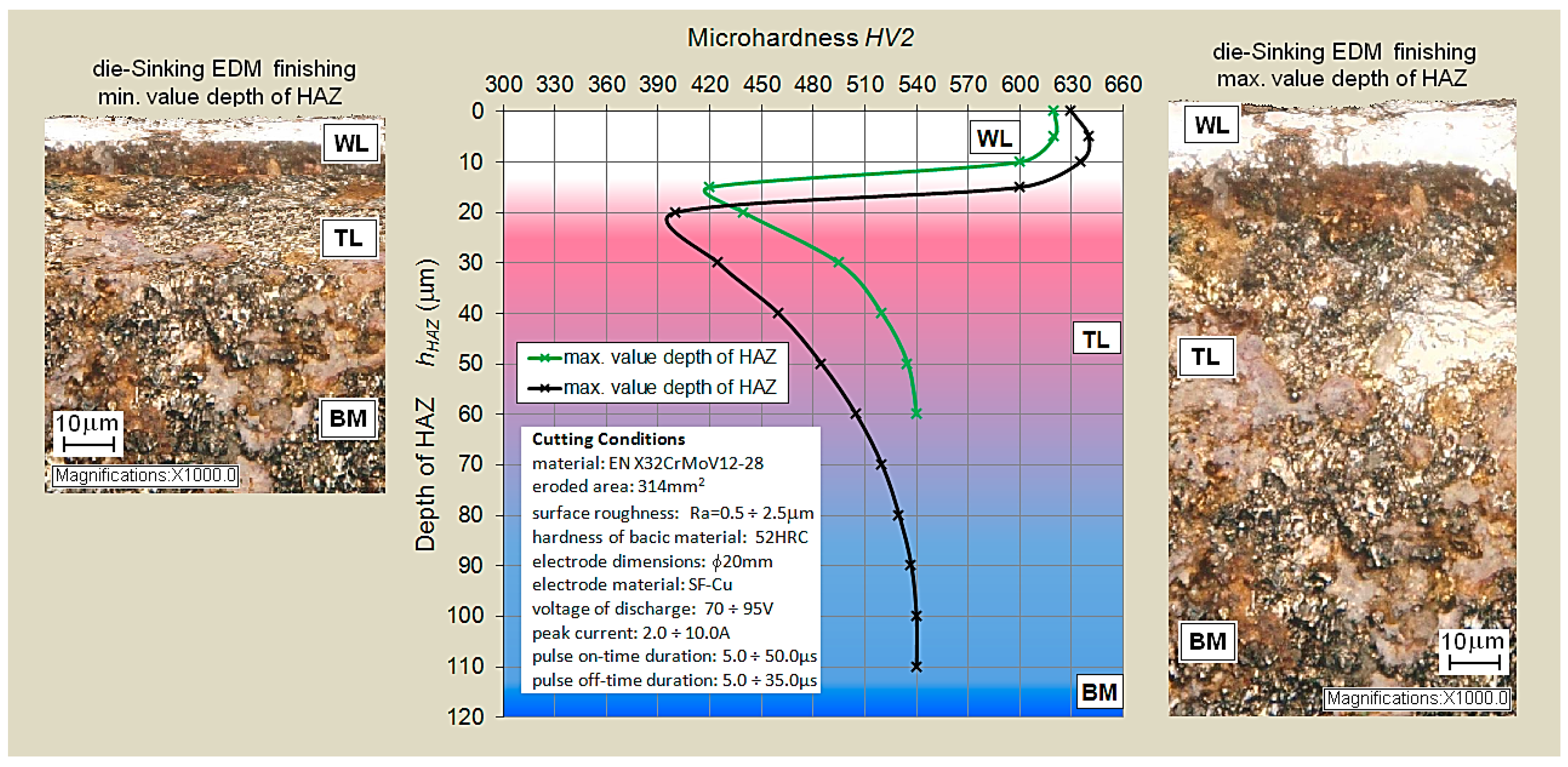 - for each layer of HAZ of tool steel EN X32CrMoV12-28 the range of thicknesses, and the microhardness change depending on the setting of important technological parameters in die-sinking EDM with a SF-Cu electrode were determined;