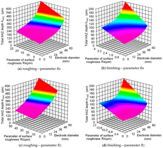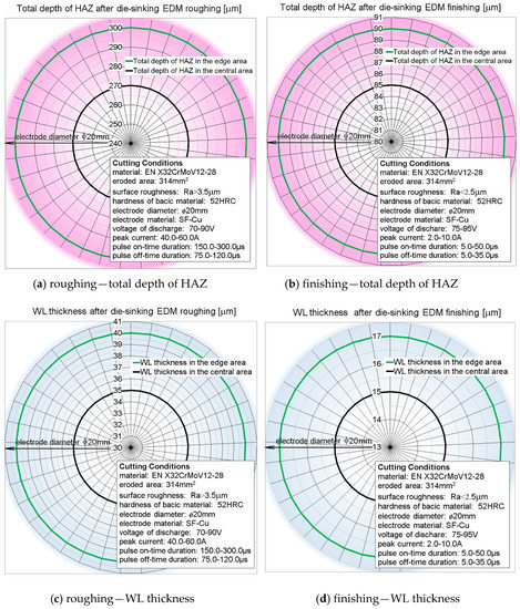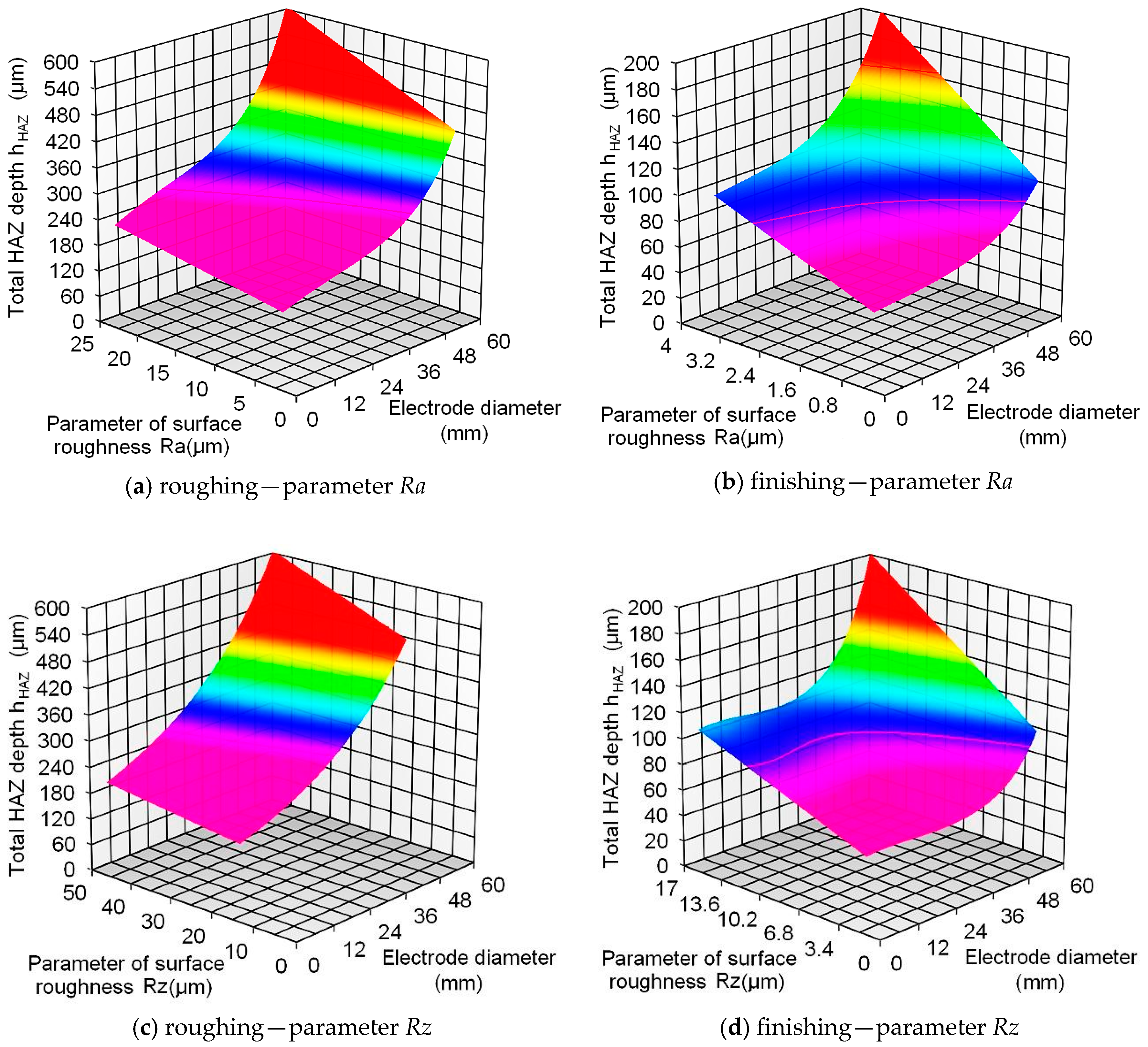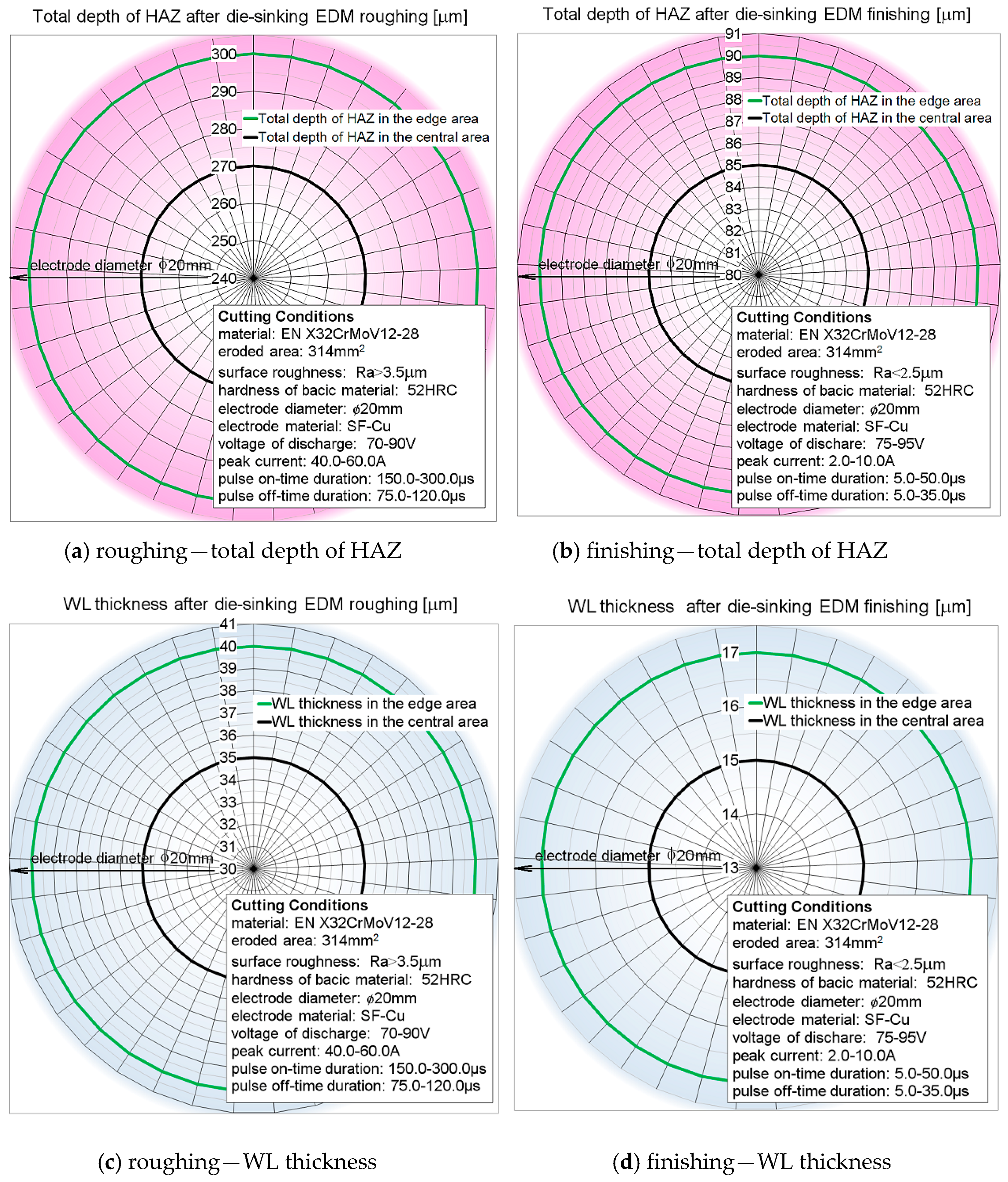 - total thickness hHAZ was determined for the roughing (120 to 280 µm), and finishing operation (60 to 100 µm) with a SF-Cu electrode of 20 mm diameter;