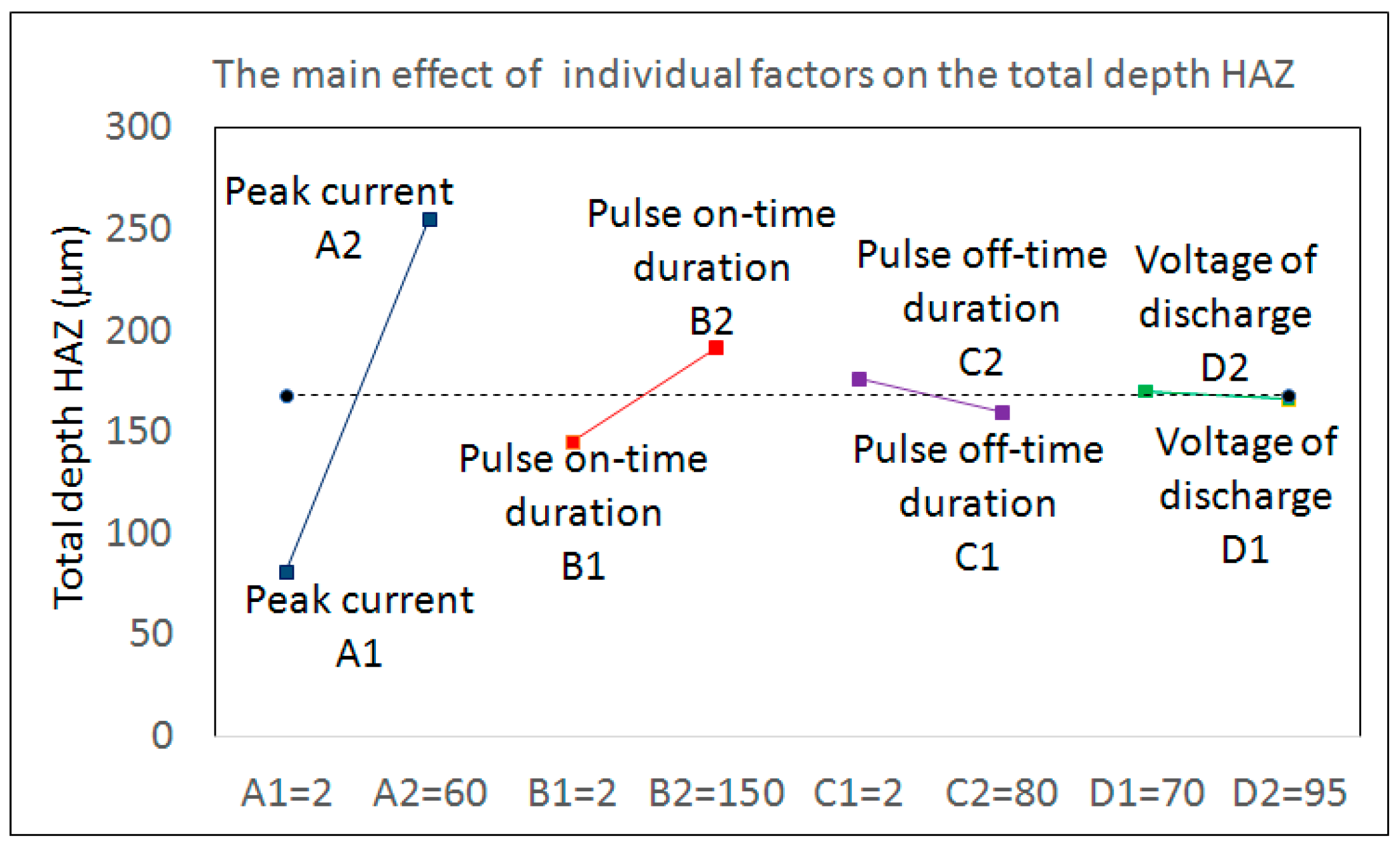 | Pulse off-time duration toff (µs) | roughing | 75.0–120.0 | With an increase of value of parameter toff microhardness slightly declines. | With an increase of value of parameter toff total HAZ depth slightly declines. |