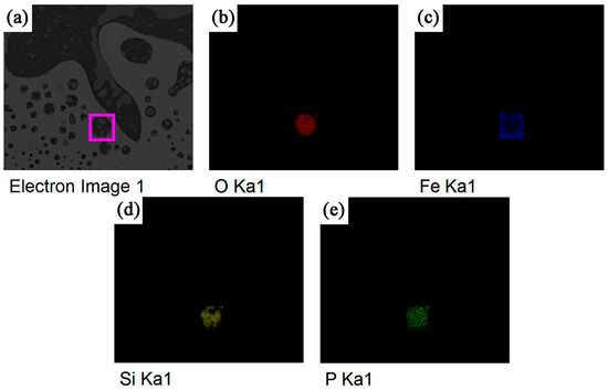 In addition, there were many dispersive particles located in the iron matrix near the interface between the matrix and inner oxide scale. In previous studies [5,6,11], these dispersive particles have been proven to be silicon dioxide in steels containing less P content. Figure 4 shows the results of selected-area elemental mapping on the dispersive particles located in the steel matrix near the interface between the iron matrix and inner oxide scale for steel SiP-2 containing 0.115 wt % P. P element can also be detected in these particles. Figure 5 gives the chemical compositions of the dispersive particles obtained by the point analysis method of EDS. It clarifies that not only silicon dioxide exists in these dispersive particles, but also P-compounds can be found when steel contains a higher P content.