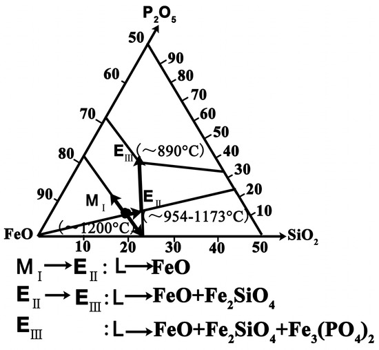 Figure 8 shows the image of the FeO-SiO2-P2O5 ternary eutectic system, which is reported by Fukagawa et al. [14]. This FeO-SiO2-P2O5 ternary eutectic system is a regional image of the whole FeO-SiO2-P2O5 ternary eutectic system which is obtained by the combination of three different binary eutectic systems. There are three temperature scales in the whole ternary eutectic system. For easier understanding of the ternary eutectic system, a regional image without temperature scales is used in the present study. Moreover, the three characteristic temperatures are given in order to show the relationship between the temperature and different phases. There are three different stages during the cooling process. First, the FeO phase crystallizes when the temperature is relatively high (point MI (~1200 °C)). Then, the Fe2SiO4 phase starts crystallizing when the temperature decreases to point EII (binary eutectic point (~954–1173 °C)). At last, the Fe3(PO4)2 phase crystallizes when the temperature decreases to the point EIII (ternary eutectic (~890 °C)). Therefore, it can be concluded that the existence of Fe3(PO4)2 phase can lower the binary eutectic point of compound Fe2SiO4/FeO. The results of this study also demonstrate that the addition of P could lower the melting point of the eutectic compound Fe2SiO4/FeO (Steel SiP-2), and a ternary eutectic compound Fe3(PO4)2/Fe2SiO4/FeO forms upon the Fe2SiO4 phase area. It is easy to wipe off the red scale when the descaling temperature is higher than the melting point of Fe2SiO4/FeO. The melting point of the eutectic compound Fe2SiO4/FeO decreases with the increasing P content, and it could reduce to 954.2 °C when the P content is 0.115 wt %. In addition, the Fe3(PO4)2 phase is detected in the net-like Fe2SiO4 area, and P-compounds are in the dispersive particles located in the iron matrix near the interface between the matrix and inner oxide scale. Furthermore, the silicon-containing steels in the present study are commercially produced and their oxide scale is formed during the reheating process in the industrial production. Therefore, the results represent oxidation behavior of steel and oxide microstructures in actual production and can provide some valuable reference from the viewpoint of industrial application.