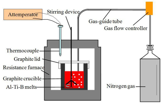 Commercial Al-5Ti-1B alloy and titanium sponge with a purity of <99.5% were used as the starting materials. A WK-II-type non-consumable vacuum arc furnace (WuKe Optoelectronics Technology Ltd., Beijing, China) was employed to prepare the as-cast Al-8Ti-1B master alloy. Then, the as-received Al-5Ti-1B alloy and the as-cast Al-8Ti-1B alloy were remelted and treated by nitriding equipment, as shown in Figure 1. The experiment was carried out in a crucible-type resistance furnace (ZhongHuan experimental electric furnace Ltd., Tianjin, China). A highly pure graphite crucible with a graphite lid was used to melt Al-5Ti-1B alloys and Al-8Ti-1B alloys, respectively. The experimental process was as follows: Firstly, the alloy charges of approximately 100 g were heated in the crucible type resistance furnace. When the temperature of the melts reached 1173 K or 1373 K, highly pure nitrogen (purity: 99.997%, O2 content <6 ppm) was introduced into the melts through the gas-guide tube (Al2O3 tube) for 1 h to 2 h at a gas flow rate of 1.0 L/ min. A stirring device was applied to mix the in situ synthetic ceramic particles with the Al melts, homogeneously. The detailed processing parameters for each composite inoculant are listed in Table 1. Finally, the melts after nitridation were then poured into a steel mold, which has a cylindrical cavity with a diameter of 20 mm and a length of 150 mm.